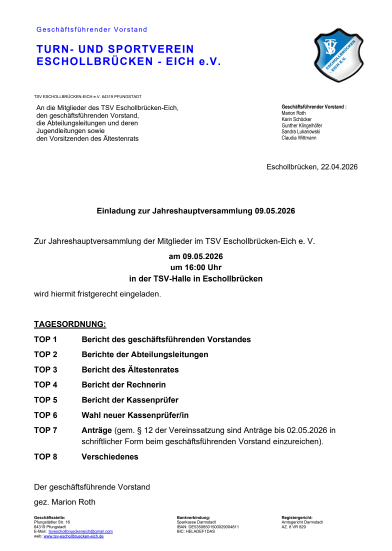 Jahreshauptversammlung 2026 am 9. Mai um 16 Uhr